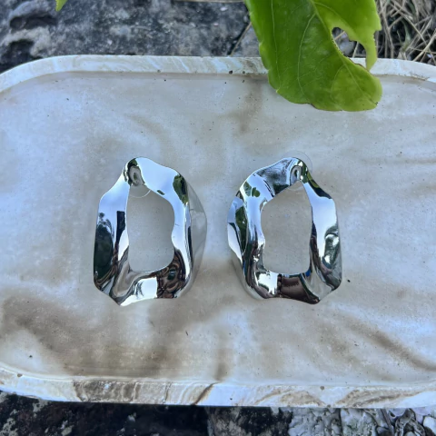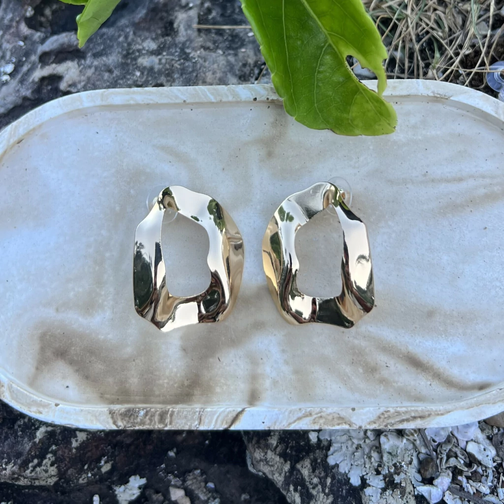 Brinco folheado a ouro 18k e prata design oval martelado.