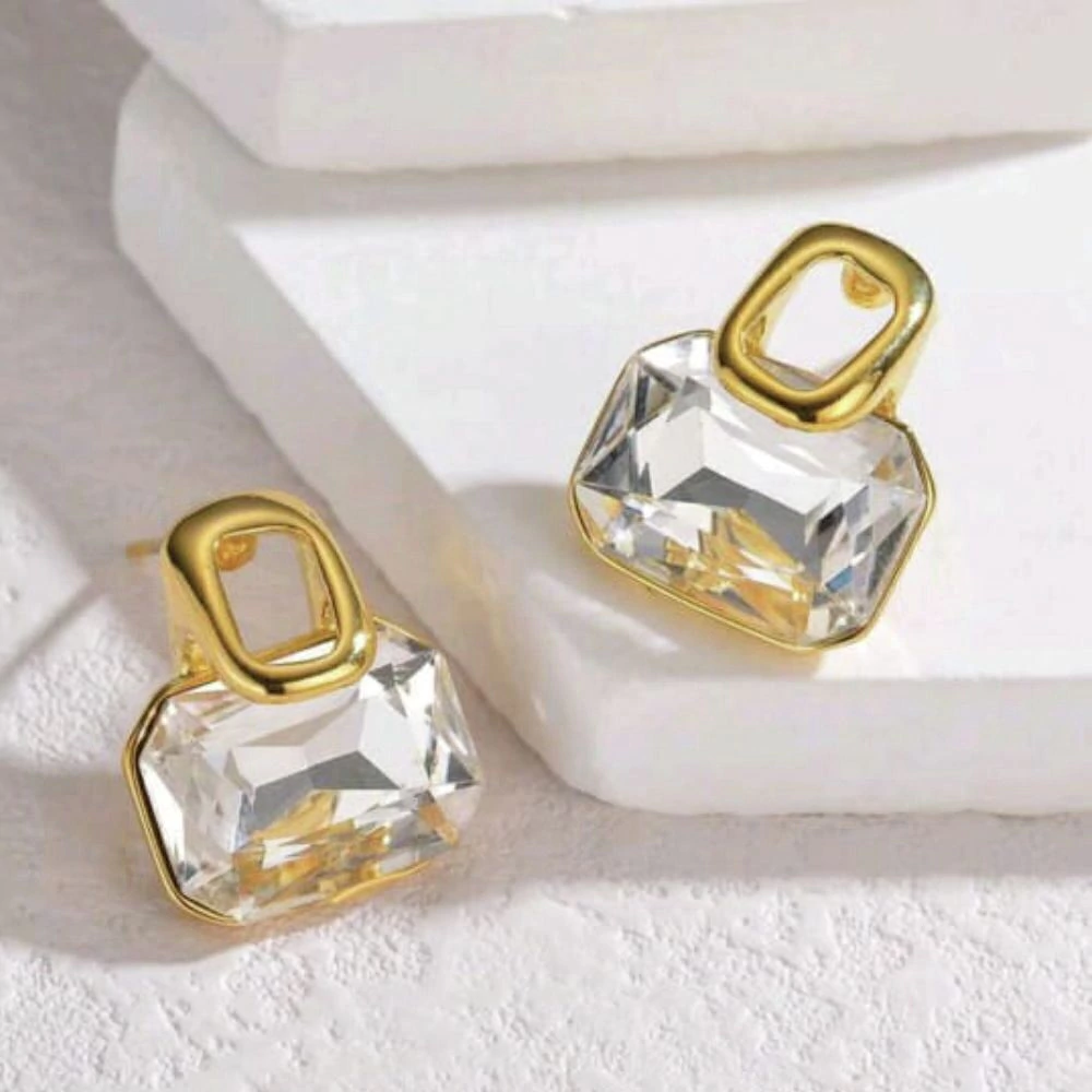 Conjunto de bijuteria composto por colar e brincos folheados a ouro, com design moderno e acabamento de alto brilho. As peças trazem um cristal retangular lapidado em corte facetado, que reflete a luz com intensidade, criando um efeito de luxo e leveza. O detalhe superior com aro oval dourado confere um toque contemporâneo e refinado ao conjunto.